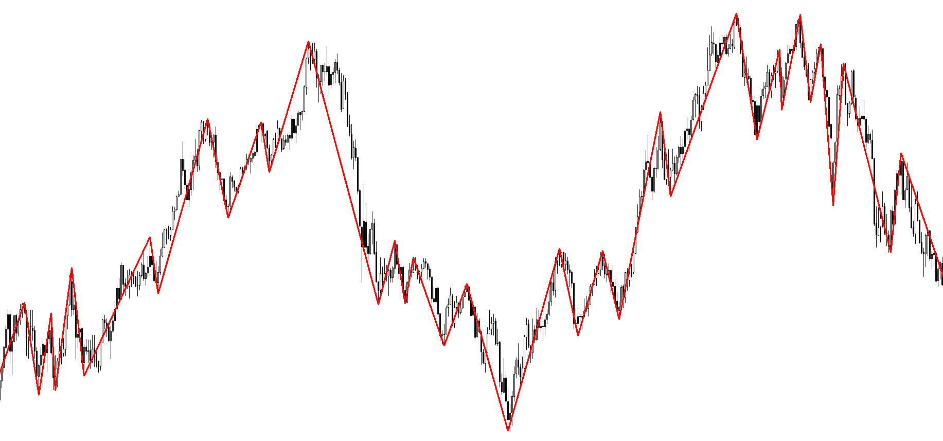 ローソク足だけでは判断し辛い場合、「ZigZag」というインジケータを使用すると、波を捉えやすくなります。