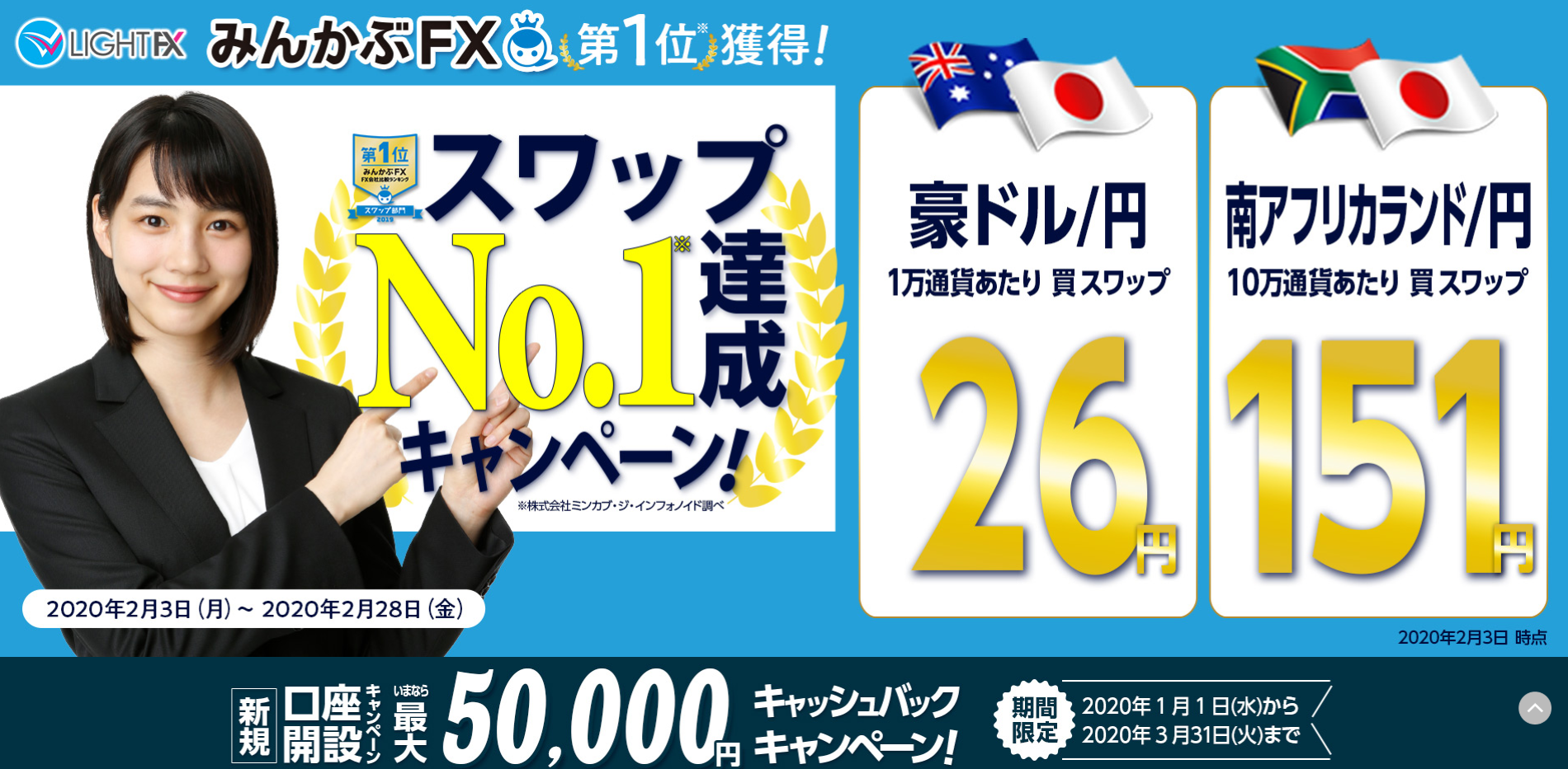 特定通貨のスワップポイントキャンペーン、新規口座開設した人向けに取引額に応じたキャッシュバックキャンペーンや、特定通貨のスプレッド変更やスワップポイントのキャンペーンも行っており、同社の「みんなのFX」よりキャンペーン数が多いです。